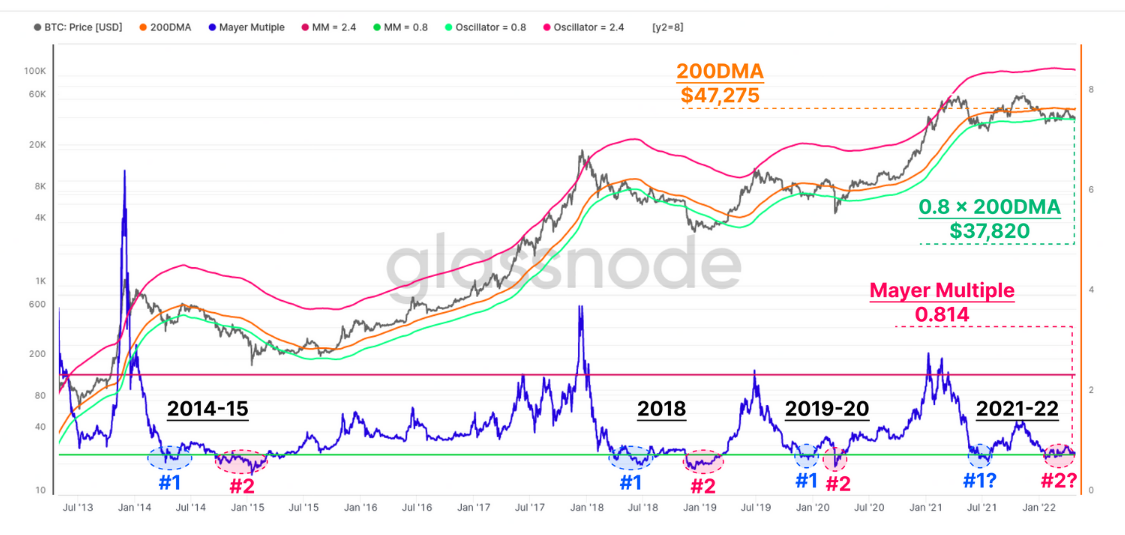 - The Mayer Multiple (MM) is an oscillator calculated by taking the ratio between price & the 200d moving average, & has historically provided reliable long-term bottom & top signals for Bitcoin cycles