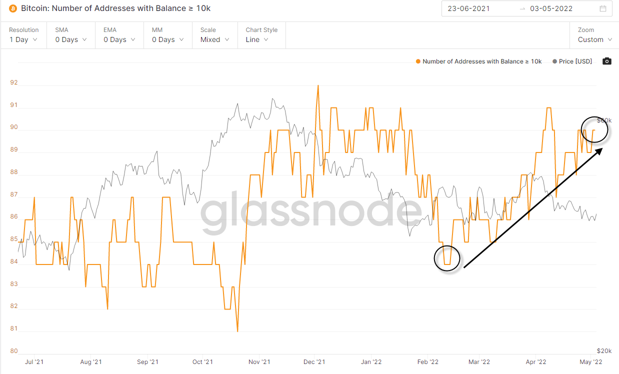- The number of addresses with a balance of over 10k BTC has steadily increased in the last three months, and rapidly in the last three weeks