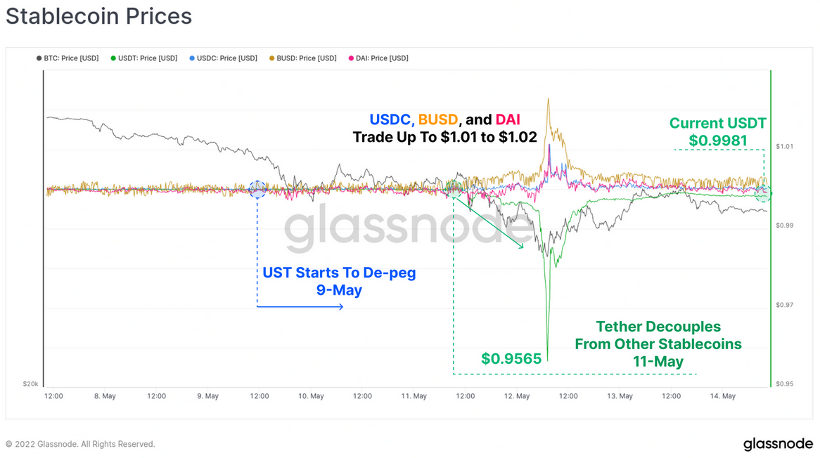 - Over the period from midday 11-May to midday 12-May, USDT traded below its $1 peg to a low of $0.9565, before recovering within 36hrs to trade at a slight discount of $0.998