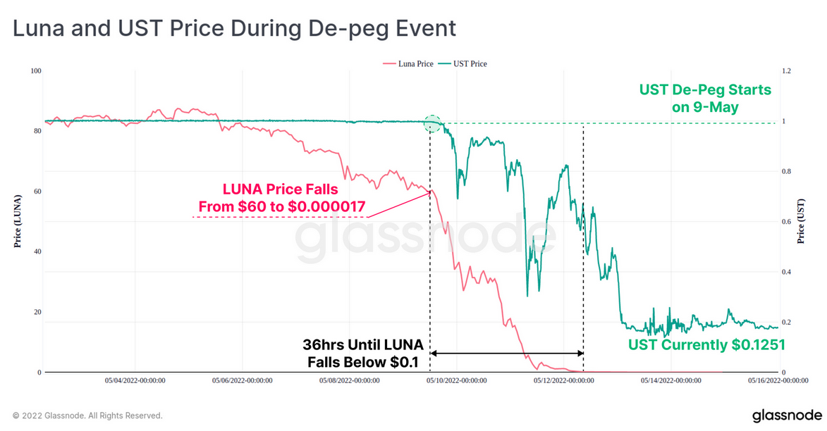 - The UST peg began to break on the 9-May, where LUNA was trading around $60 (~49.5% off the $119 ATH)