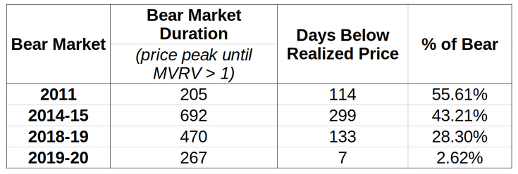 The table above shows the previous bear market cycles, and the proportion of time when prices traded below the realized price