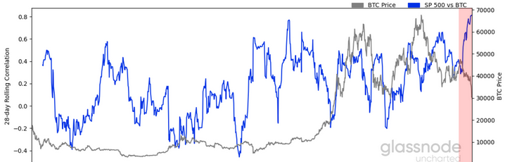 - From a macro perspective, as the bond selloff turns systematic, the correlation between bitcoin and the S&P 500 has soared to unprecedented levels