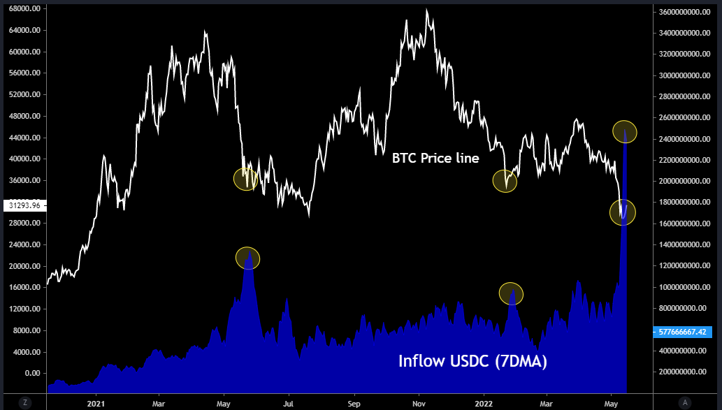 Bottoms in BTC price have coincided on three occasions with spikes in USDC exchange inflow since 2021