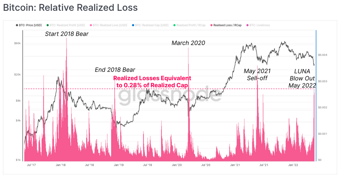 The 'relative realized loss' metric is established by dividing daily realized loss across the network by the Realized Cap to compare apples between cycles, as the total value of BTC, and therefore the value of losses has grown over time